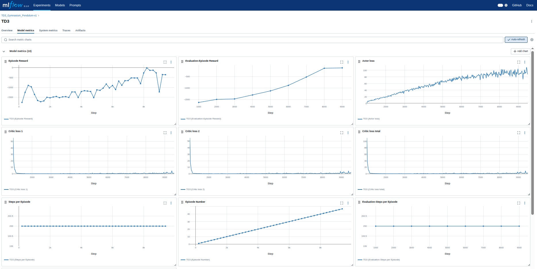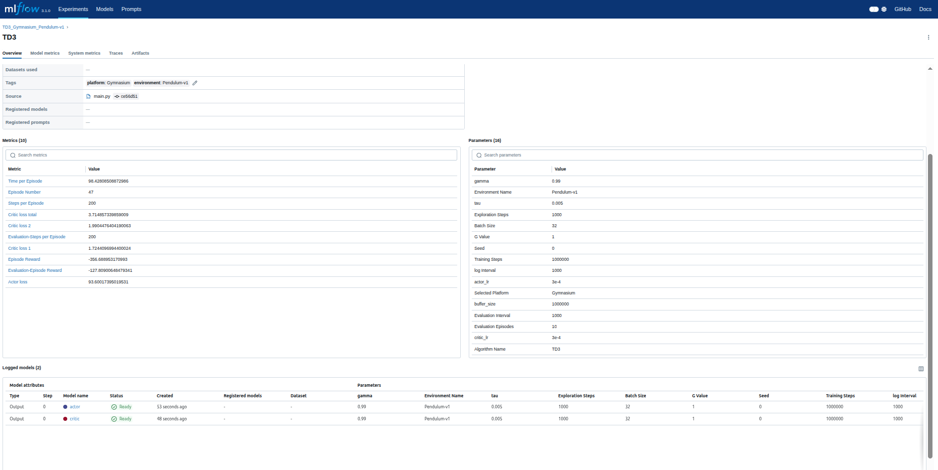 ReinforceUI Studio offers seamless integration with MLflow, a powerful tool for tracking and visualizing machine learning experiments. During training, you can click the “Open MLflow Dashboard” button at any time to monitor your experiment’s metrics and artifacts in real time.